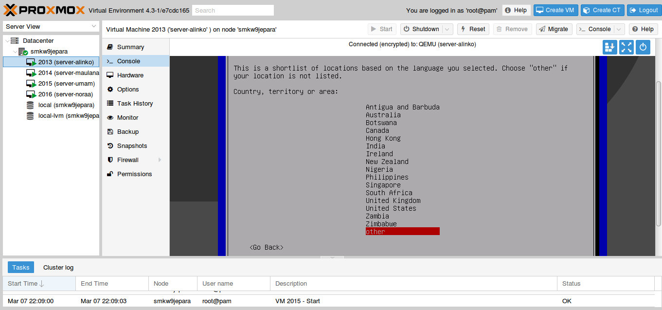 Setelah membuat VM di proxmox maka langkah selanjutnya mulai menginstall debian 8.6 via console proxmox